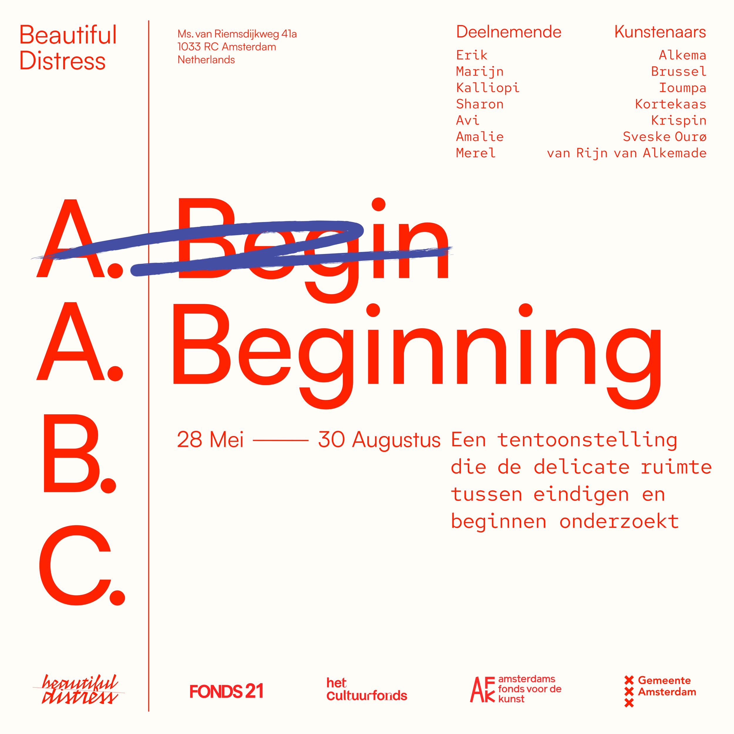 A. Beginning brengt zeven kunstenaars samen die allemaal op de een of andere manier opnieuw zijn begonnen. Sommigen zijn pas afgestudeerd; anderen hervatten hun werk na ziekte of persoonlijke crises. Samen verkennen de werken wat het betekent om opnieuw te beginnen, soms vanuit vrije keuze, en soms omdat het leven geen alternatief biedt.